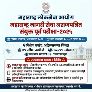 B1न्यूज मराठी नेटवर्क अहिल्यानगर : महाराष्ट्र लोकसेवा आयोगामार्फत आयोजित 'महाराष्ट्र नागरी सेवा अराजपत्रित संयुक्त पूर्व परीक्षा-२०२५' दि. ४ जानेवारी २०२६...