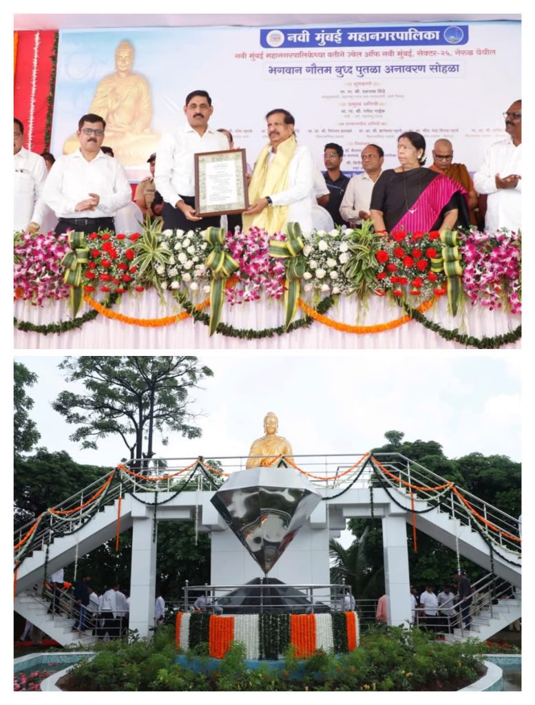 नवी मुंबई : महापालिकेच्या वतीने नेरूळ येथील ज्वेल ऑफ नवी मुंबई या ठिकाणी भगवान गौतम बुध्द यांच्या पुतळ्याचा अनावरण समारंभ महाराष्ट्र राज्याचे वन मंत्री गणेश नाईक यांच्या हस्ते, बेलापूर विधानसभा सदस्य आ. मंदाताई म्हात्रे, महापालिका आयुक्त डॉ.कैलास शिंदे यांच्या प्रमुख उपस्थितीत संपन्न झाला.
