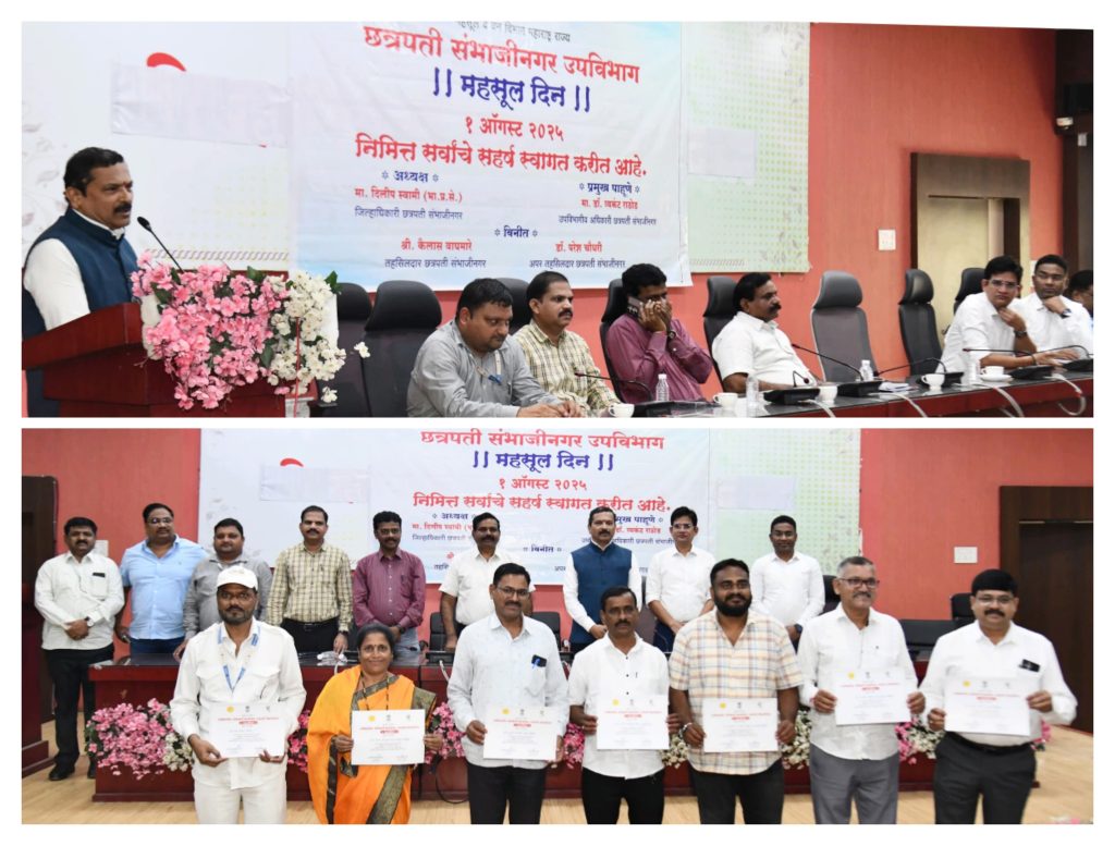 छत्रपती संभाजीनगर उपविभागामार्फत महसूल दिन कार्यक्रमाचे आयोजन आज जिल्हाधिकारी कार्यालयातील नियोजन सभागृहात करण्यात आले.जिल्हाधिकारी दिलीप स्वामी, अपर जिल्हाधिकारी संभाजीराव अडकुणे, जिल्हा पुरवठा अधिकारी प्रवीण फुलारी, उपजिल्हाधिकारी संगिता राठोड, उपविभागीय अधिकारी डॉ. व्यंकट राठोड, तहसिलदार कैलास वाघमारे, अपर तहसिलदार डॉ. परेश चौधरी आदी उपस्थित होते.