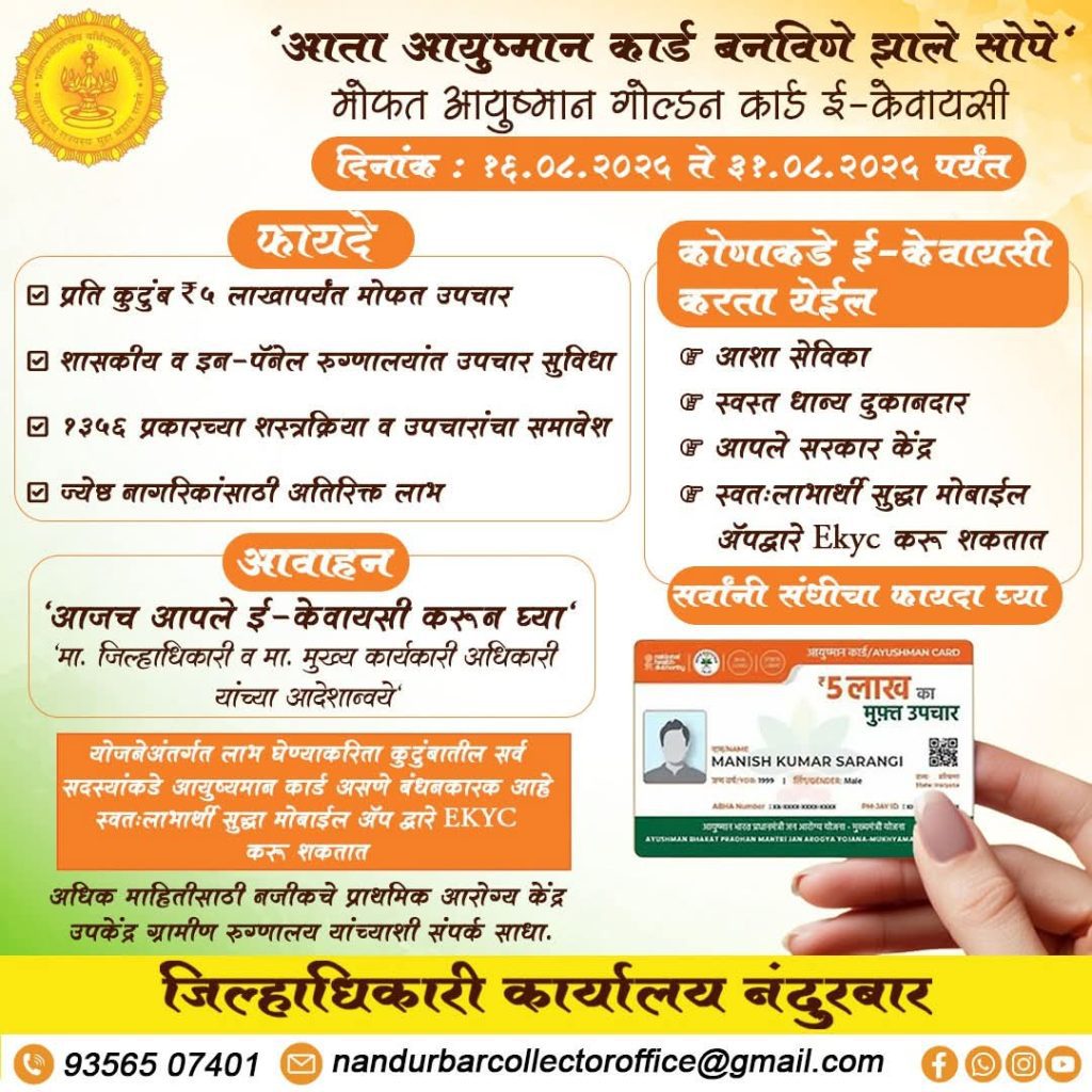 नंदुरबार : जिल्हा प्रशासनामार्फत दिनांक १६ ऑगस्ट २०२५ ते ३१ ऑगस्ट २०२५ दरम्यान विशेष मोहीम राबविण्यात येत आहे. जिल्हा प्रशासनाचे आवाहन आहे की सर्व पात्र नागरिकांनी या कालावधीत आपले व कुटुंबातील सदस्यांचे आयुष्मान भारत गोल्डन कार्ड तयार करून घ्यावेत.