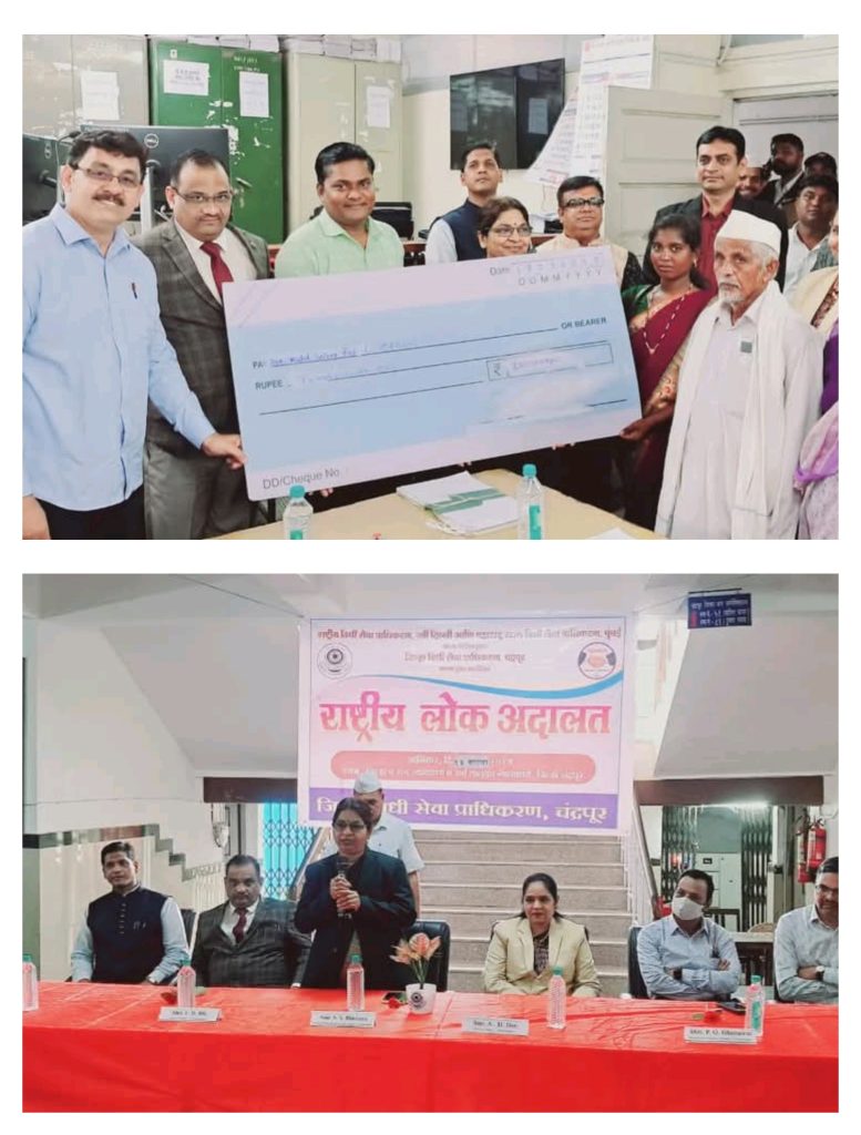 चंद्रपूर : राष्ट्रीय विधी सेवा प्राधिकरण, नवी दिल्ली आणि महाराष्ट्र राज्य विधी सेवा प्राधिकरण, मुंबई यांच्या निर्देशानुसार आज दि. १३ सप्टेंबर रोजी चंद्रपूर जिल्हा न्यायालयासह सर्व तालुक्यातील न्यायालयांमध्ये राष्ट्रीय लोकअदालतीचे आयोजन करण्यात आले.