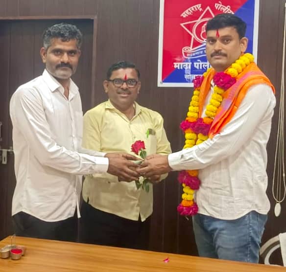 माढा पोलीस स्टेशनचे सपोनि नेताजी बंडगर यांना राष्ट्रपती शौर्य पुरस्कार मिळाल्याबद्दल सत्कार करताना आदर्श शिक्षक राजेंद्र गुंड सर व कवी बाबासाहेब लोंढे.