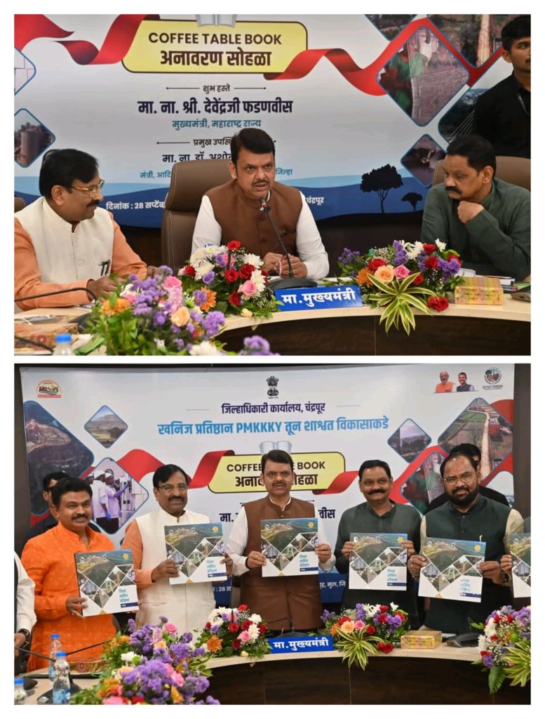 मुल (जि. चंद्रपूर) येथील विश्रामगृहात, जिल्हा खनिज प्रतिष्ठानच्या वतीने तयार करण्यात आलेल्या कॉफी टेबल बुकचे अनावरण करताना मुख्यमंत्री बोलत होते. यावेळी राज्याचे आदिवासी विकास मंत्री तथा चंद्रपूर जिल्ह्याचे पालकमंत्री डॉ. अशोक उईके, आमदार सर्वश्री सुधीर मुनगंटीवार, किशोर जोरगेवार, देवराव भोंगळे यांच्यासह जिल्हाधिकारी विनय गौडा, मुख्य कार्यकारी अधिकारी पुलकित सिंह अतिरिक्त जिल्हाधिकारी डॉ. नितीन व्यवहारे, जिल्हा खनिकर्म अधिकारी रोहन ठवरे व इतर अधिकारी उपस्थित होते.