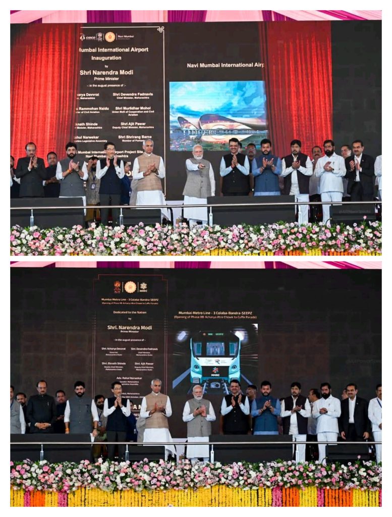 प्रधानमंत्री नरेंद्र मोदीजी यांच्या शुभहस्ते नवी मुंबई अंतरराष्ट्रीय विमानतळ आणि मुंबई मेट्रो तीनच्या अंतिम टप्प्याचा लोकार्पण सोहळा पार पडला. तसेच यावेळी त्यांच्या हस्ते राज्यातील ४१९ औद्योगिक प्रशिक्षण संस्था आणि १४१ शासकीय तांत्रिक विद्यालयात अल्पमुदतीच्या अभ्यासक्रमांचाही शुभारंभ करण्यात आला. या कार्यक्रमाला राज्यपाल आचार्य देवव्रत, केंद्रीय हवाई वाहतूक मंत्री श्री. किंजरापू नायडू, मुख्यमंत्री देवेंद्र फडणवीस, उपमुख्यमंत्री अजित पवार ,उपमुख्यमंत्री एकनाथ शिंदे, केंद्रीय राज्यमंत्री मुरलीधर मोहोळ आणि कौशल्य, रोजगार,उद्योजकता व नाविन्यता मंत्री श्री. मंगलप्रभात लोढा व इतर मान्यवर उपस्थित होते.