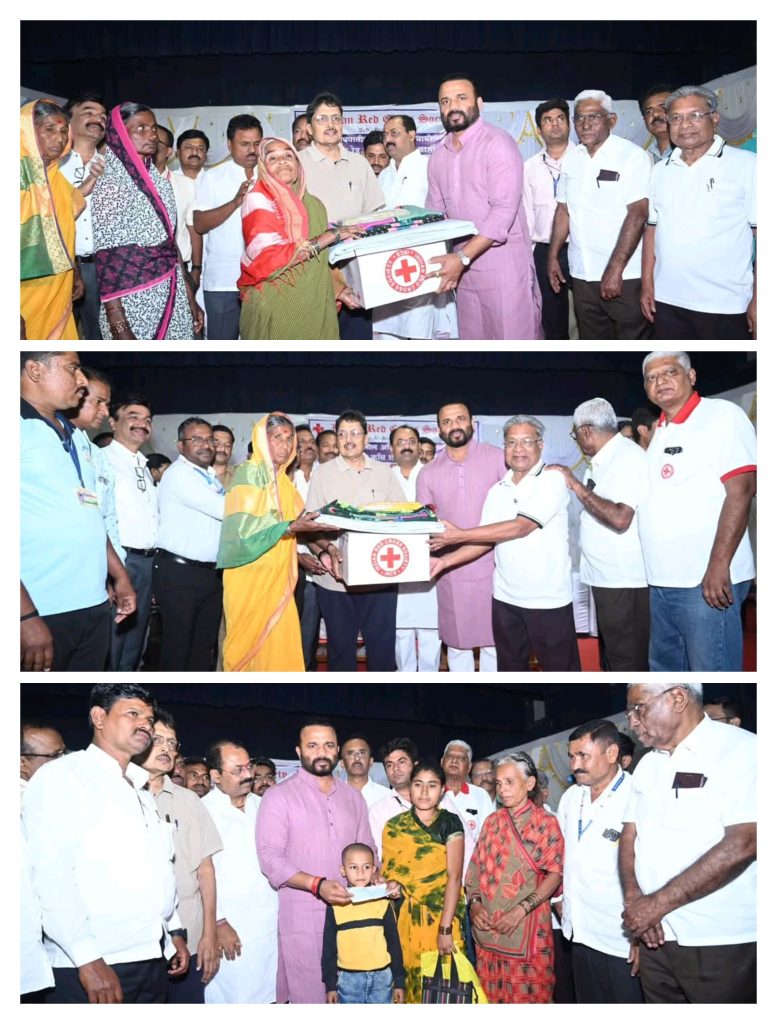 बार्शी : इंडियन रेड क्रॉस सोसायटी बार्शीच्या वतीने बार्शी तालुक्यातील अतिवृष्टी व पूरग्रस्त बाधित 1200 लाभार्थ्यांना संसार उपयोगी साहित्याचे वाटप पालकमंत्री जयकुमार गोरे यांच्या हस्ते करण्यात आले. यावेळी माजी आमदार राजेंद्र राऊत, इंडियन रेड क्रॉसचे सचिव अजित कुंकूलोळ, प्रांताधिकारी सदाशिव पडदुने, तहसीलदार एफ.आर.शेख, पोलीस निरीक्षक बालाजी कुकडे,शिवाजी शिक्षण प्रसारक मंडळाचे अध्यक्ष डॉ. बी वाय यादव, माजी नगराध्यक्ष असिफभाई तांबोळी, माजी नगराध्यक्ष रमेश पाटील, इंडियन रेड क्रॉसचे उपाध्यक्ष डॉ. विक्रम निमकर संतोष सूर्यवंशी, अशोक डहाळे, डॉ. दिलीप कराड, अतुल सोनिग्रा, प्रतापराव जगदाळे, प्रशांत बुडून उपस्थित होते.