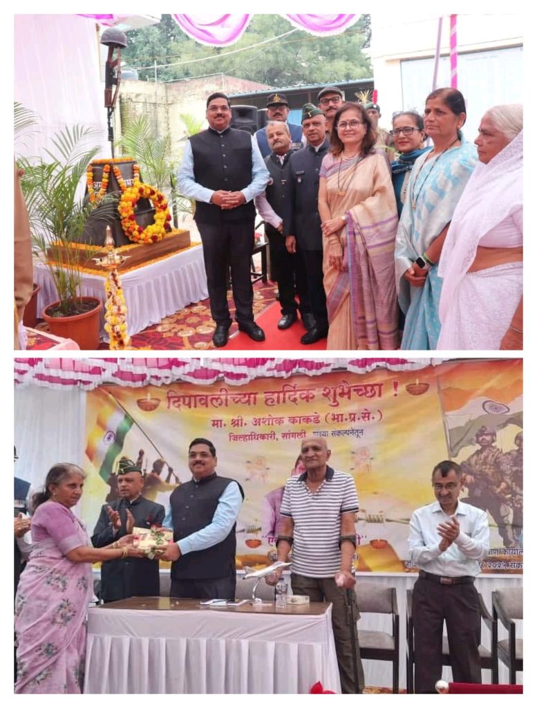 सांगली : ‘दिवाळी सकाळ सैनिका परिवारासोबत’ साजरी करण्याच्या उद्देशाने सांगलीचे जिल्हाधिकारी अशोक काकडे यांच्या संकल्पनेतून ‘एक दिवा सैनिकांसाठी’ हा अभिनव उपक्रम आज महावीर चक्र विजेते शहीद पांडुरंग साळुंखे संकुल सांगली येथे उत्साहात पार पडला.