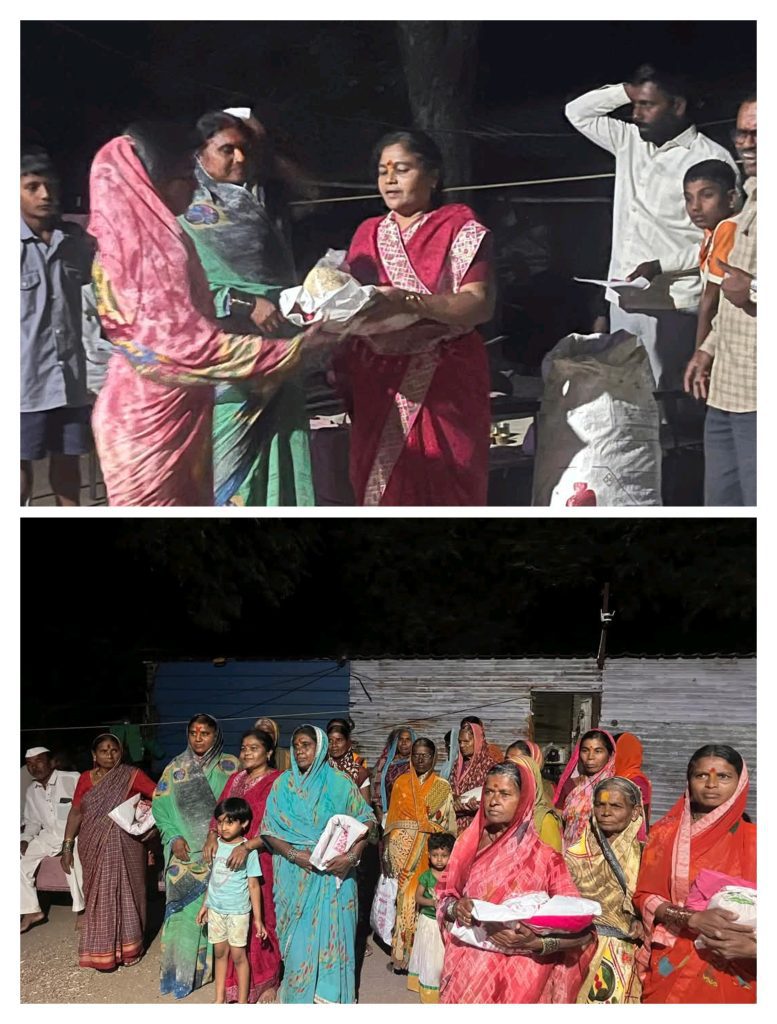 दिवाळीनिमित्त देवगाव (मा.) येथील पूरग्रस्त कुटुंबांना साडी व धान्य किट वाटप