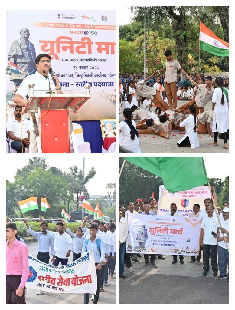 सोलापूर, दि. 24 : मेरा युवा भारत (युवा कार्यक्रम आणि क्रीडा मंत्रालय, भारत सरकार) यांच्यामार्फत 2025 हे वर्ष भारताचे लोहपुरुष आणि राष्ट्रीय एकात्मतेचे प्रमुख शिल्पकार सरदार वल्लभभाई पटेल यांची 150 वी जयंती वर्ष म्हणून साजरे केले जात आहे. याचे औचित्य साधून राष्ट्रीय एकता दिनानिमित्त 31 ऑक्टोबर ते 25 नोव्हेंबर 2025 दरम्यान संपूर्ण भारतभर जिल्हास्तरीय पदयात्रा आयोजित केल्या जात आहेत. या अनुषंगाने सोलापूर जिल्ह्यात आज पदयात्रेचे आयोजन करण्यात आले होते.