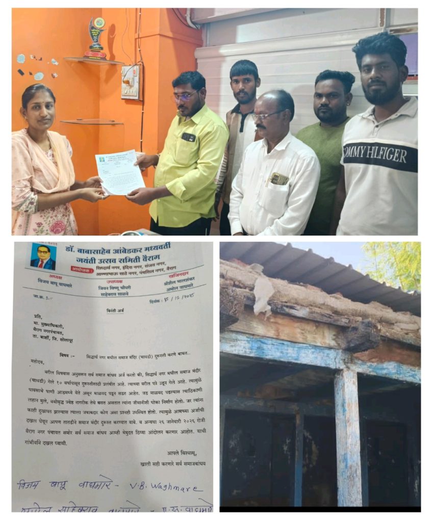 वैराग : सिद्धार्थनगर मधील अनेक वर्षापूर्वी बांधण्यात आलेले समाज मंदिर मोडकळीस आले असून त्याची त्वरीत दुरुस्ती करावी याबाबतचे निवेदन डॉ .बाबासाहेब आंबेडकर मध्यवर्ती जयंती उत्सव समितीच्या वतीने वैराग नगरपंचायतीच्या मुख्याधिकारी विद्या पाटील यांना देण्यात आले.