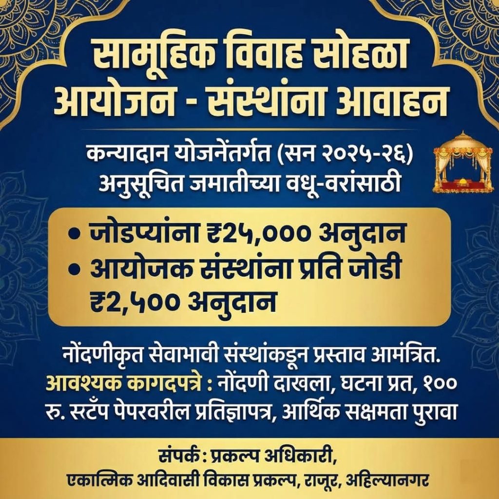 अहिल्यानगर : कन्यादान योजनेतर्गत जिल्ह्यातील अनुसूचित जमातीच्या वधू-वरांसाठी सामूहिक विवाह सोहळ्याचे आयोजन करण्यासाठी नामांकित नोंदणीकृत सेवाभावी संस्था व यंत्रणांनी प्रस्ताव सादर करावेत, असे आवाहन राजूर एकात्मिक आदिवासी विकास प्रकल्प अधिकारी देवकन्या बोकडे यांनी केले आहे.