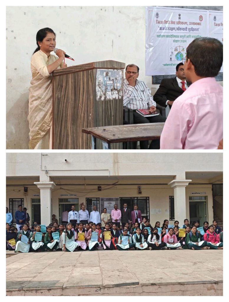 धाराशिव, दि. ९ जानेवारी : जिल्हा विधी सेवा प्राधिकरण, उस्मानाबाद व छत्रपती शिवाजी माध्यमिक व उच्च माध्यमिक विद्यालय,धाराशिव यांच्या संयुक्त विद्यमाने ‘बालविवाह मुक्त भारत — आपला संकल्प अभियान’,पर्यावरण आणि सामुदायिक संरक्षण उपक्रमाविषयी जनजागृती कार्यक्रम छत्रपती शिवाजी माध्यमिक व उच्च माध्यमिक विद्यालय,धाराशिव येथे आयोजित करण्यात आला.हा कार्यक्रम जिल्हा विधी सेवा प्राधिकरण अध्यक्षा तथा प्रमुख जिल्हा व सत्र न्यायाधीश श्रीमती अभिश्री देव यांच्या मार्गदर्शनाखाली संपन्न झाला.