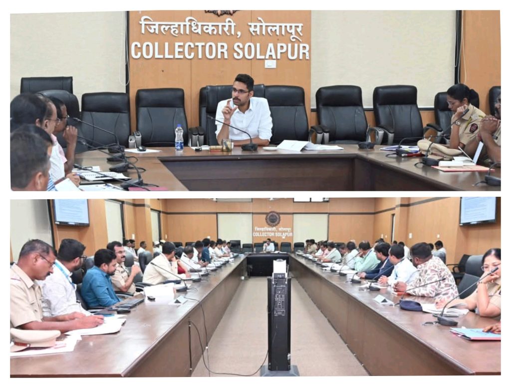 नियोजन भवन येथील सभागृहात आयोजित श्री सिद्धेश्वर महायात्रा 2026 च्या अनुषंगाने पूर्वतयारी आढावा बैठकीत जिल्हाधिकारी आशीर्वाद मार्गदर्शन करत होते. यावेळी महापालिकेचे अतिरिक्त आयुक्त संदीप कारंजे, श्रीमती विना पवार, सोलापूर शहर पोलीस उपायुक्त अश्विनी पाटील, महायात्रा इन्सीडेंट कमांडर तथा शहर अभियंता श्रीमती सारिका आकुलवार, उपविभागीय अधिकारी सदाशिव पडदुणे, अन्न व औषध प्रशासनाचे सहाय्यक आयुक्त साहेबराव देसाई, सार्वजनिक बांधकाम विभागाचे कार्यकारी अभियंता मनोज ठाकरे यांच्यासह अन्य संबंधित विभाग प्रमुख तसेच पंच कमिटीचे सदस्य उपस्थित होते.