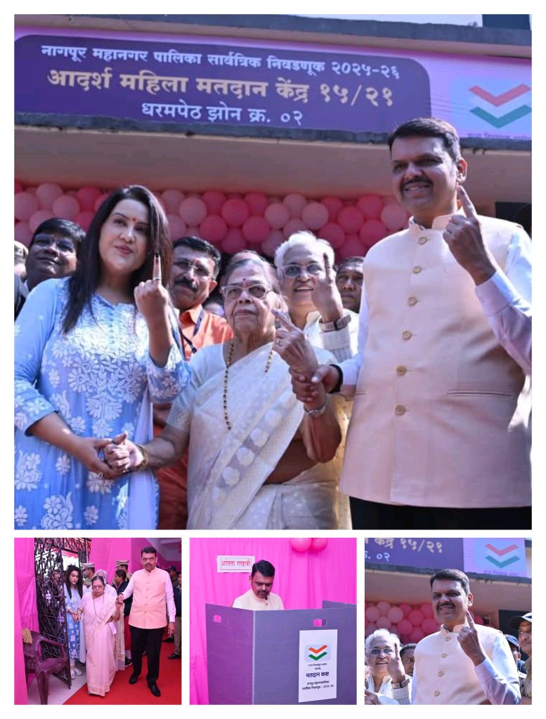 मुख्यमंत्री देवेंद्र फडणवीस यांनी धरमपेठ भागातील व्हीआयपी रोडवरील धरमपेठ हिंदी उच्च प्राथमिक शाळेच्या आदर्श महिला मतदान केंद्रावर त्यांच्या मातोश्री सरिता फडणवीस आणि पत्नी अमृता फडणवीस यांच्यासह मतदान केले.