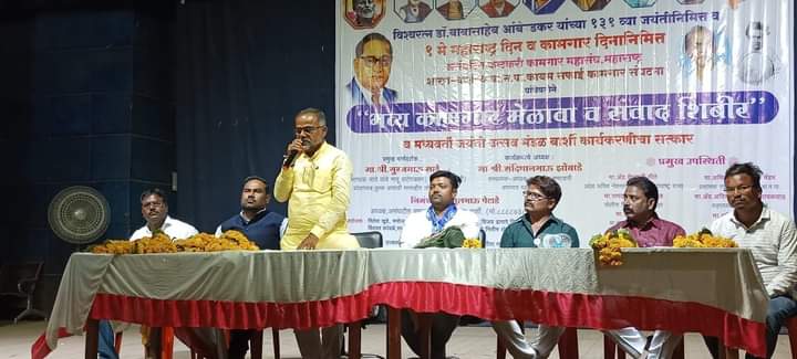 बार्शी : विश्वरत्न डॉ बाबासाहेब आंबेडकर यांच्या १३१ व्या जयंतीनिमित्त व महाराष्ट्र दिन व कामगार दिनाच्या निमित्ताने बार्शी येथील यशवंतराव चव्हाण सांस्कृतिक भवन येथे झालेल्या असंघटित कष्टकरी कामगार मेळाव्याचे आयोजन करण्यात आले होते.