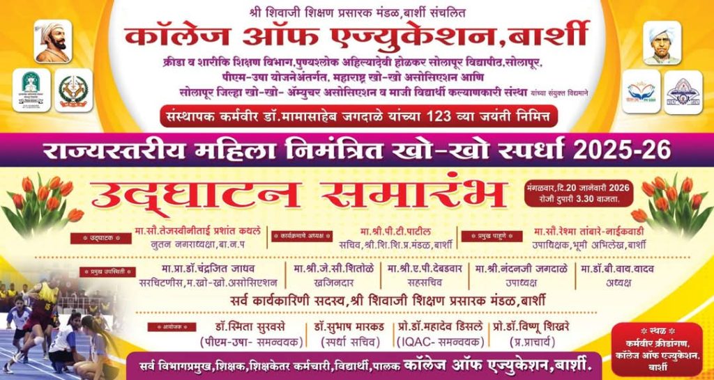 बार्शी : श्री शिवाजी शिक्षण प्रसारक मंडळ बार्शी संचलित कॉलेज ऑफ एज्युकेशन, बार्शी, महाराष्ट्र खो-खो असोसिएशन व सोलापूर असोसिएशन यांच्या संयुक्त विद्यमाने कर्मवीर डॉ. मामासाहेब जगदाळे यांच्या 123 व्या जयंतीनिमित्त विभागीय निमंत्रित महिला गट खो-खो स्पर्धा आयोजन श्री शिवाजी शिक्षण प्रसारक मंडळ बार्शीचे संस्थापक व संवर्धक कर्मवीर डॉ. मामासाहेब जगदाळे यांच्या 123 व्या जयंतीनिमित्त कॉलेज ऑफ एज्युकेशन बार्शी येथे दिनांक 20 ते 22 जानेवारी 2026 या कालावधीत विभागीय निमंत्रित महिला गट खो-खो स्पर्धा आयोजित करण्यात आल्याची माहिती कॉलेजचे प्रभारी प्राचार्य डॉ. व्ही. पी. शिखरे सर यांनी दिली.