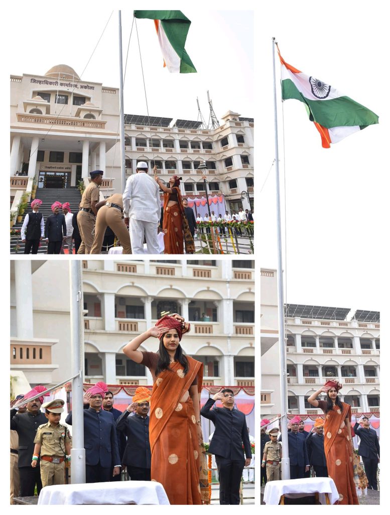 अकोला दि. 26 : भारताच्या 77 व्या प्रजासत्ताक दिनानिमित्त जिल्हाधिकारी कार्यालयाच्या प्रांगणात जिल्हाधिकारी वर्षा मीना यांच्या हस्ते राष्ट्रध्वज वंदन झाले.