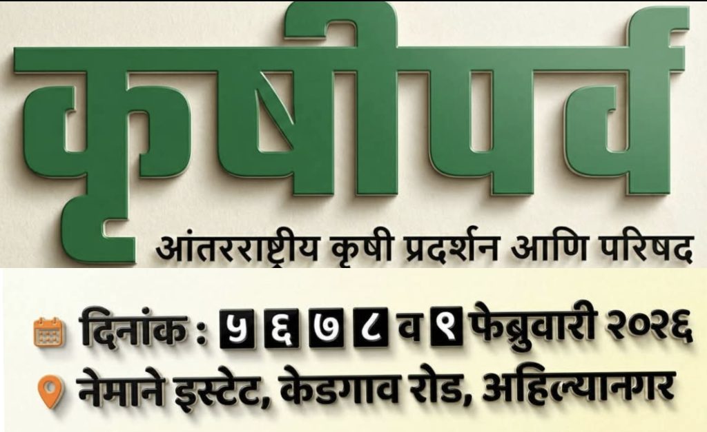 अहिल्यानगर, दि.३ : कृषी विभाग, आत्मा, जिल्हा परिषद अहिल्यानगर व एक्सपो इंडियन ओशियन प्रा. लि. यांच्या संयुक्त विद्यमाने ५ ते ९ फेब्रुवारी २०२६ या कालावधीत नेमाने इस्टेट, केडगाव रोड येथे भव्य जिल्हा कृषी महोत्सव ‘कृषीपर्व’ व कृषी परिषदेचे आयोजन करण्यात आले आहे. शेतकऱ्यांना आधुनिक तंत्रज्ञानाची माहिती, कृषी उत्पादनांचे प्रदर्शन व थेट खरेदी-विक्रीची संधी उपलब्ध करून देण्याच्या उद्देशाने हा महोत्सव आयोजित करण्यात आला असल्याची माहिती जिल्हा अधीक्षक कृषी अधिकारी सुधाकर बोराळे यांनी दिली आहे.