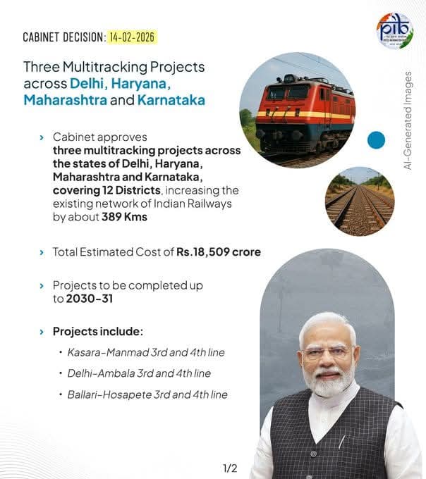 नवी दिल्ली१५ : पंतप्रधान नरेंद्र मोदी यांच्या नेतृत्वाखालील आर्थिक व्यवहारविषयक मंत्रिमंडळ समितीने भारतीय रेल्वेच्या पायाभूत सुविधांना बळकटी देणाऱ्या तीन महत्त्वाच्या बहुमार्गी प्रकल्पांना मंजुरी दिली आहे. या निर्णयामुळे महाराष्ट्र, दिल्ली, हरियाणा आणि कर्नाटक या चार राज्यांतील १२ जिल्ह्यांमध्ये रेल्वेचे जाळे विस्तारणार असून, एकूण ३८९ किलोमीटरची भर पडणार आहे. १८,५०९ कोटी रुपये अंदाजे खर्च असलेले हे प्रकल्प २०३०-३१ पर्यंत पूर्ण करण्याचे उद्दिष्ट ठेवण्यात आले आहे.